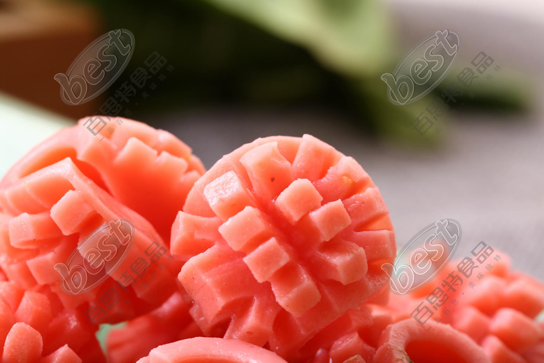 产品特点:本产品由肠衣灌制而成,又切成段后进行深加工而成。外形新颖,形似盛开的桂花,故取名为桂花肠。